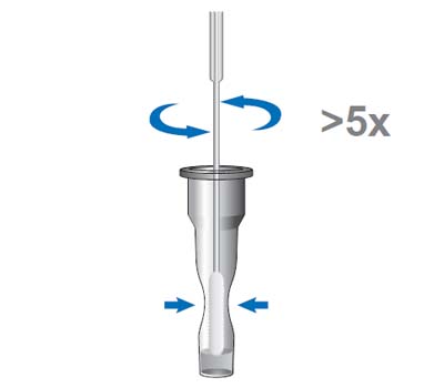 2. Inserire il bastoncino in una provetta contenente iltampone di estrazione. Strizzare la provetta contenenteil tampone di estrazione e, contemporaneamente,ruotare il bastoncino più di 5 volte.